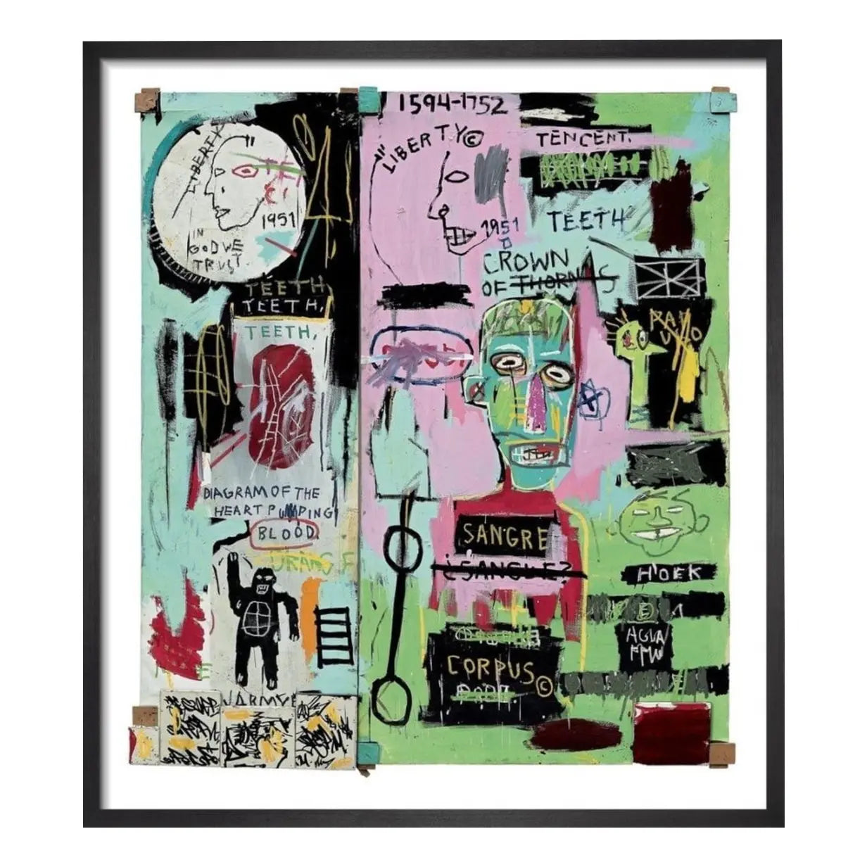Jean-Michel Basquiat framed print features areproduction of In Italian (1983) a work by Basquiat. (pre-owened)